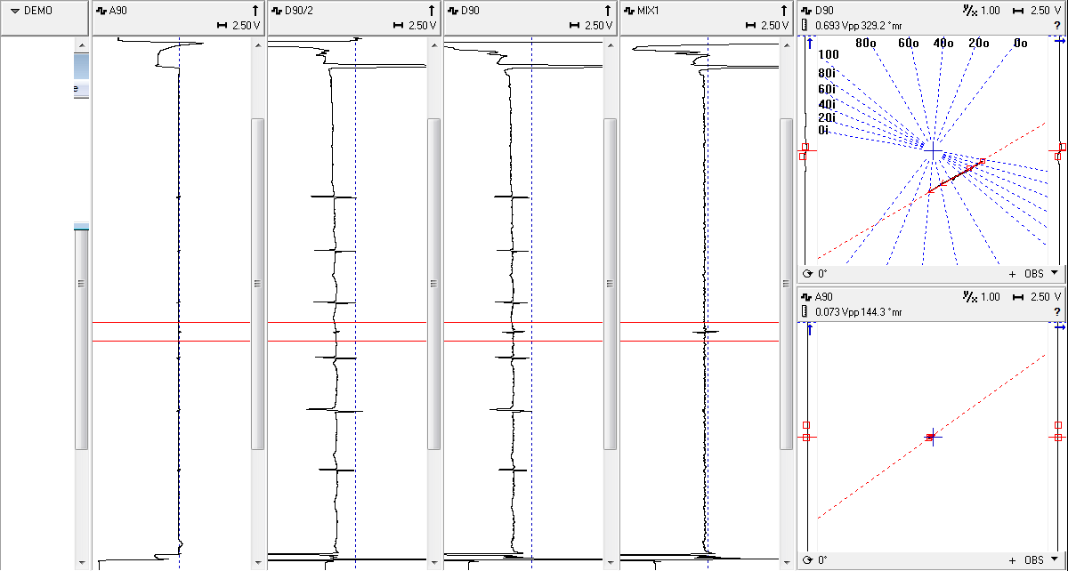 在某化工厂换热器管束ECT检测时发现管束中间位置出现类似缺陷的非相关显示信号,如图1所示,与样管人工缺陷图谱(图2)相比较,其相位角与D90相位不相符,未出现相位角度数值、8字型,与差分通道相比较非常相似,与绝对通道相比较有区别,经IRIS检测(图3)后发现管束中间位置有变形。
