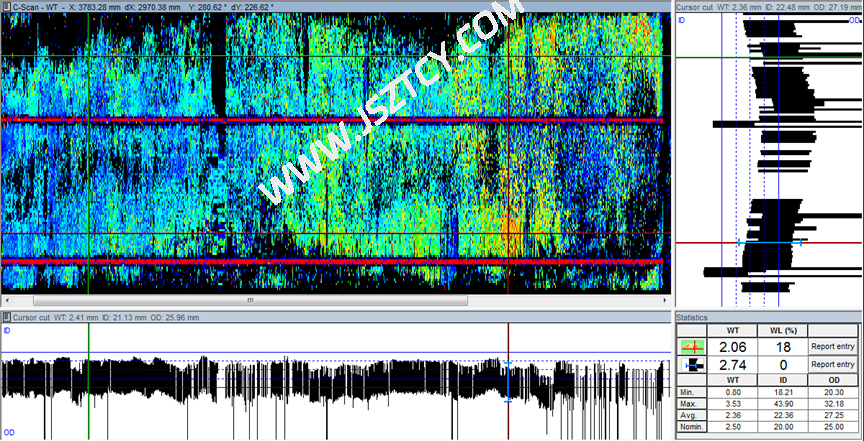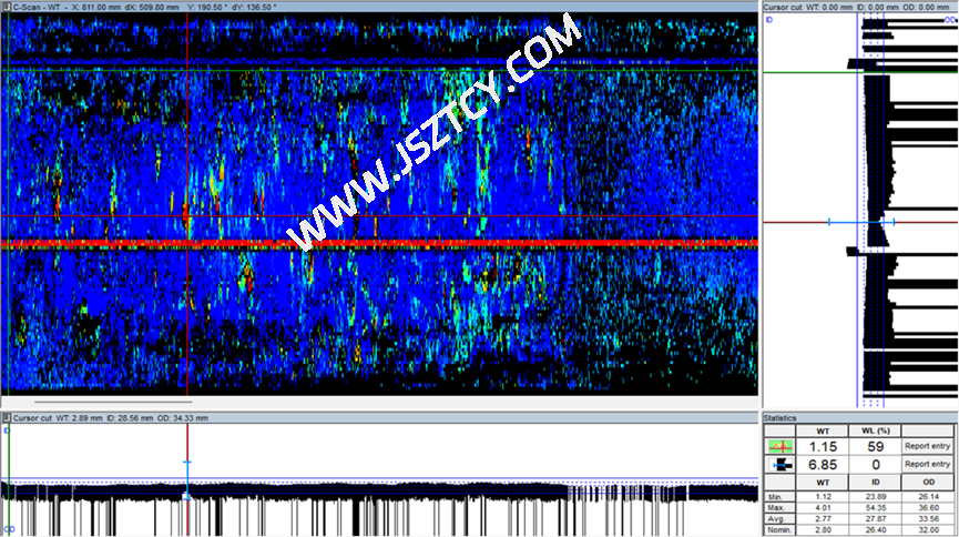 - 检测过程:首先要求甲方对于检修的换热器进行彻底清洗,去除管壁的杂质及污垢来确保检测结果的准确性。根据要求,本次采用内旋转超声检测技术进行检测,这能确保在不损坏换热器内壁的同时检测出内壁腐蚀情况。在每台设备检测结束的当天即时分析获得的数据,将其结果汇报给对应负责人以便于进行之后的工作安排。