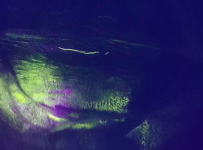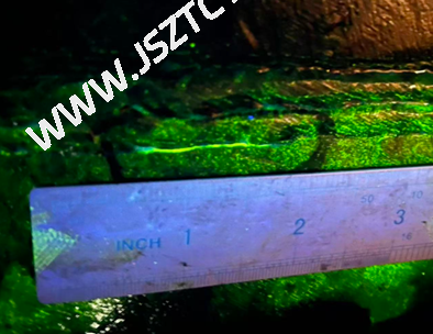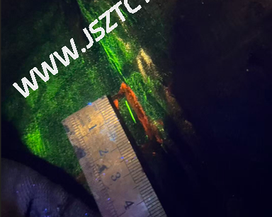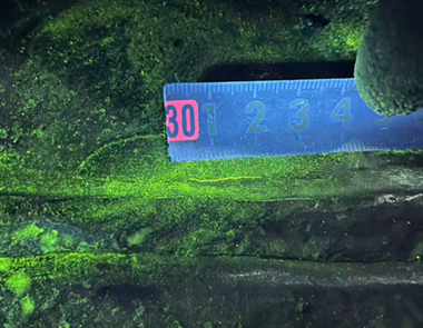 现场检测的第一个关键环节是表面缺陷初查。罐体内壁经打磨处理后,检测人员手持磁粉探伤仪,沿着焊接缝和母材关键区域缓慢移动。由于这是在密闭幽暗的环境下检测,此次采用了湿式荧光磁粉检测,磁粉探伤仪的荧光灯下,一条条线性磁痕格外明显,这些是典型的焊接表面微裂纹缺陷。随后用渗透检测剂复核,红色的渗透液在裂纹处形成清晰的显示迹线,进一步确认了缺陷的位置与尺寸。