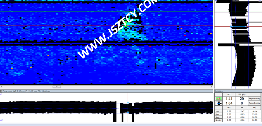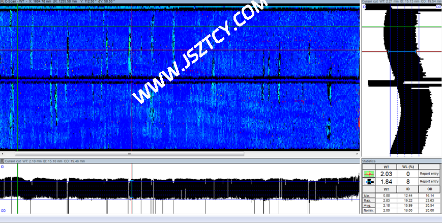 检测情况:在检测过程中,发现本台换热器所有管束在距离上管板1米范围内存在局部减薄,管束原始壁厚为2mm,减薄后壁厚为1.19mm左右,减薄量为原始壁厚的41%,具体情况如下图所示: