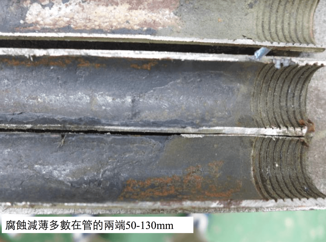 后来他们把更换下来管子送到我们公司,当我看到时管子已经全部解剖开了,仔细一看果然是在端口2-4”(50-100mm) 的位置出现明显的腐蚀加减薄,(见图1、2)